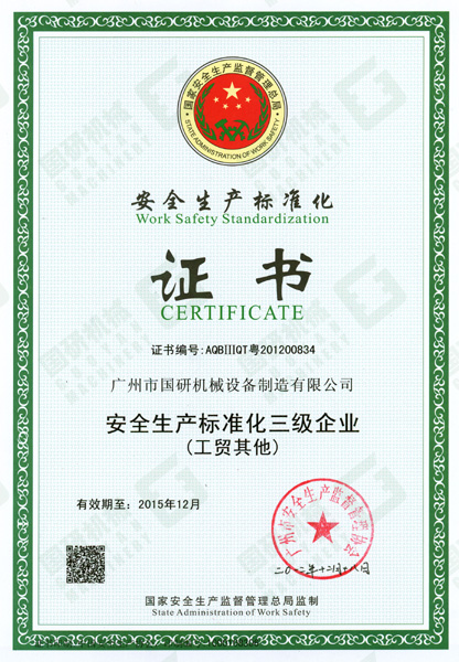 2012年12月24日,國家安全生產監(jiān)督管理總局為國研機械公司頒發(fā)了《安全生產標準化企業(yè)證書》,這意味著我司已達到《廣州市工業(yè)企業(yè)安全生產標準化評定辦法》及《廣州市工業(yè)企業(yè)安全生產標準化評定標準》的要求。