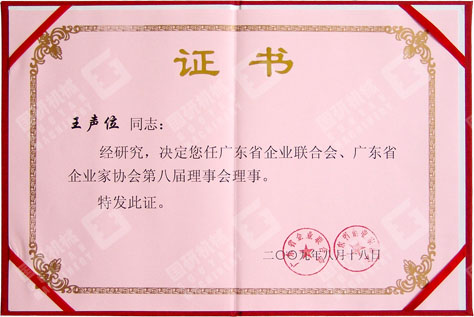 2009年8月18日,廣東省企業(yè)聯(lián)合會(huì)、廣東省企業(yè)家協(xié)會(huì)授予廣州市國研機(jī)械設(shè)備制造有限公司為省企業(yè)聯(lián)合會(huì)、省企業(yè)家協(xié)會(huì)第八屆理事會(huì)理事單位,同時(shí)授予公司董事長兼總經(jīng)理王聲位同志為第八屆理事會(huì)理事。