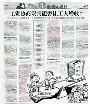 7月14日,《南方日?qǐng)?bào)》以《工資協(xié)商談判能否讓工人增收?——國(guó)研公司實(shí)踐的工資協(xié)商談判或是突破》為題,用三分之二大版篇幅報(bào)道廣州市國(guó)研機(jī)械設(shè)備制造有限公司實(shí)踐工資集體協(xié)商的成功經(jīng)驗(yàn)。