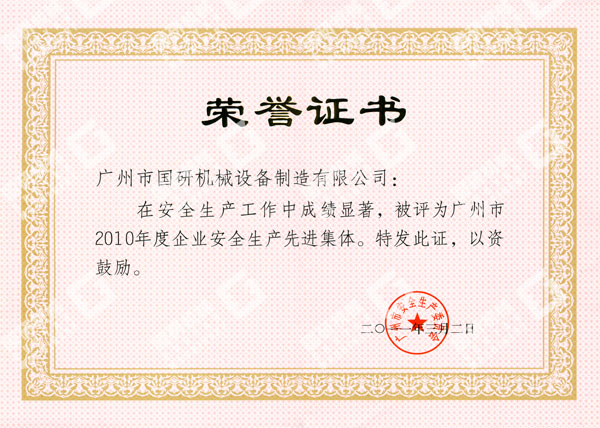 近日,在廣州市人民政府召開(kāi)的安全生產(chǎn)工作總結(jié)暨表彰大會(huì)上再次傳來(lái)喜訊,廣州市國(guó)研機(jī)械設(shè)備制造有限公司被廣州市人民政府授予“廣州市2010年度企業(yè)安全生產(chǎn)先進(jìn)集體”榮譽(yù)稱號(hào)。這是我司獲得中華全國(guó)總工會(huì)和國(guó)家安全生產(chǎn)監(jiān)督管理總局授予2009年度全國(guó)“安康杯”競(jìng)賽優(yōu)勝企業(yè)稱號(hào)后,被授予的又一殊榮。